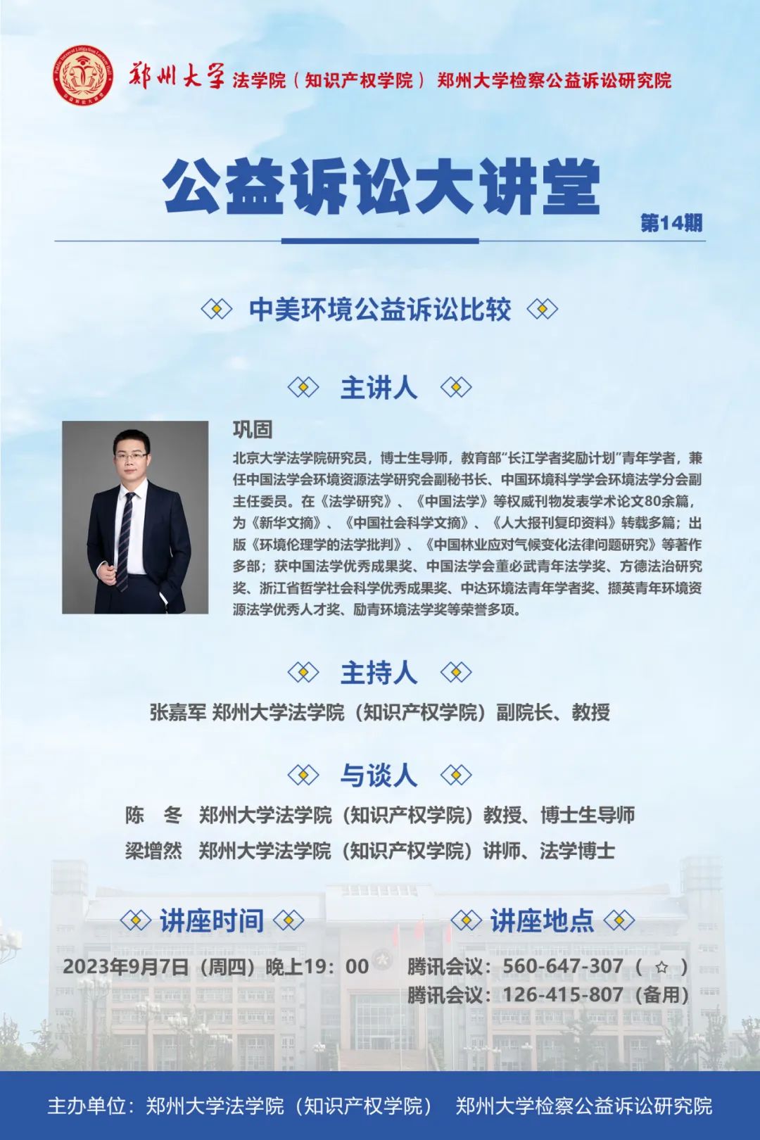 ![]() ![]() 本文字数:562字阅读时间:2分钟 公益诉讼大讲堂 为深入贯彻二十大报告提出的“完善公益诉讼制度”要求,繁荣公益诉讼学术、深化公益诉讼研究,郑州大学法学院(知识产权学院)、郑州大学检察公益诉讼研究院特推出“公益诉讼大讲堂”系列学术活动。本期大讲堂特邀请北京大学法学院博士生导师、教育部“长江学者奖励计划”青年学者巩固研究员针对“中美环境公益诉讼比较”这一主题进行讲座。 诚邀您参加本次讲座,具体安排如下: ![]() 讲座主题中美环境公益诉讼比较 讲座时间2023年9月7日(周四)晚上19:00 讲座地点腾讯会议:560-647-307(★) 腾讯会议:126-415-807(备用) 主讲人简介 巩固,北京大学法学院研究员,博士生导师,教育部“长江学者奖励计划”青年学者,兼任中国法学会环境资源法学研究会副秘书长、中国环境科学学会环境法学分会副主任委员。在《法学研究》、《中国法学》等权威刊物发表学术论文80余篇,为《新华文摘》、《中国社会科学文摘》、《人大报刊复印资料》转载多篇;出版《环境伦理学的法学批判》、《中国林业应对气候变化法律问题研究》等著作多部;获中国法学优秀成果奖、中国法学会董必武青年法学奖、方德法治研究奖、浙江省哲学社会科学优秀成果奖、中达环境法青年学者奖、撷英青年环境资源法学优秀人才奖、励青环境法学奖等荣誉多项。 与谈人 陈冬郑州大学法学院(知识产权学院)教授、博士生导师 梁增然郑州大学法学院(知识产权学院)讲师、法学博士 主持人 张嘉军郑州大学法学院(知识产权学院)副院长、博士生导师,郑州大学检察公益诉讼研究院执行院长 ![]() ![]() ![]() ![]() 顾问单位:河南国基律师事务所 ![]() 策划:张嘉军审核:刘 鋆编辑:韦 柱 ![]() 扫码关注 |