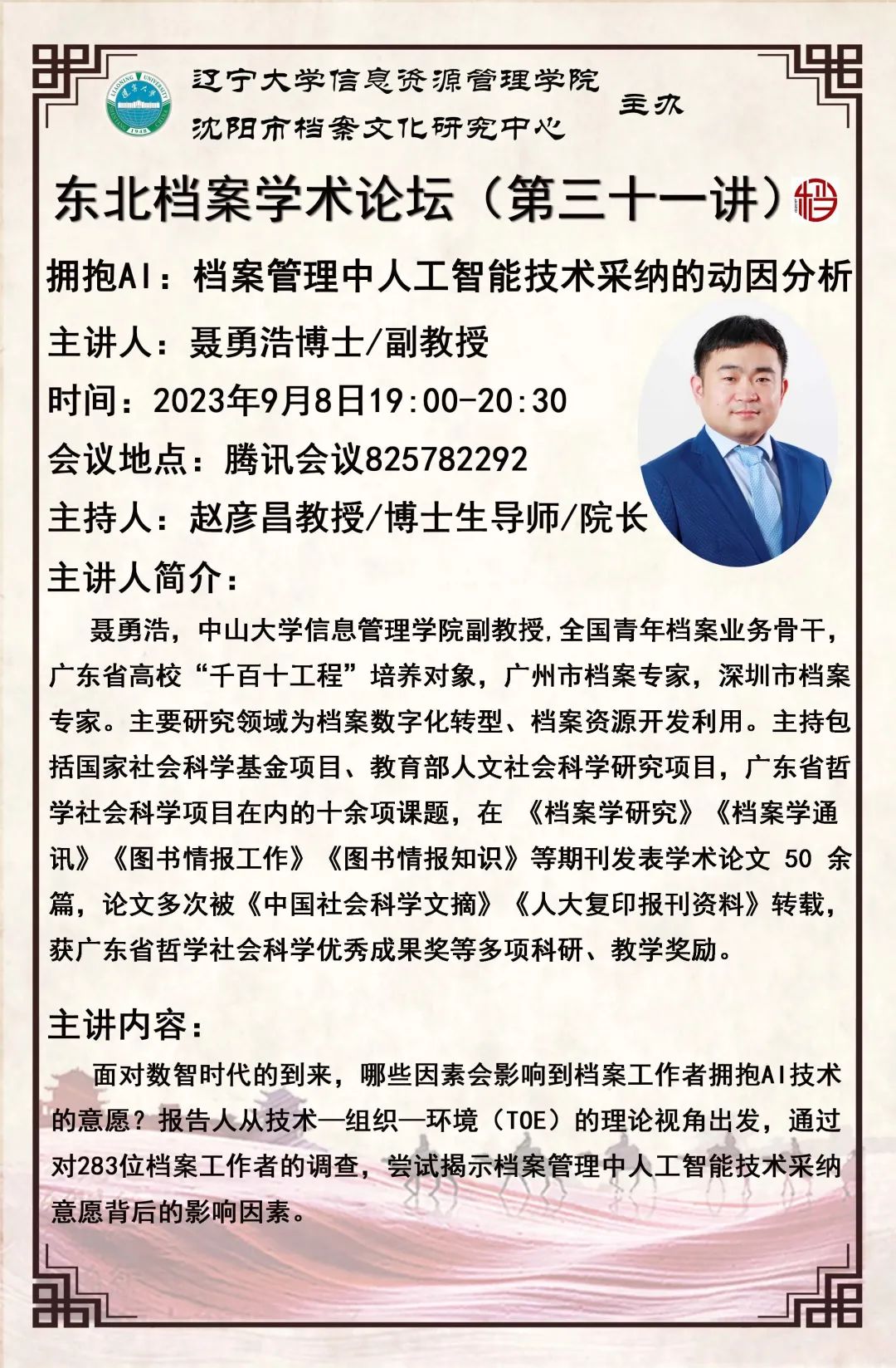 ![]() ![]() 讲座信息 主题:《拥抱AI:档案管理中人工智能技术采纳的动因分析》主讲人:聂勇浩博士/副教授时间:2023年9月8日19:00-20:30会议地点:腾讯会议 825782292主持人:赵彦昌教授/博士生导师/院长 主讲人介绍 聂勇浩,中山大学信息管理学院副教授,全国青年档案业务骨干,广东省高校“千百十工程”培养对象,广州市档案专家,深圳市档案专家。主要研究领域为档案数字化转型、档案资源开发利用。主持包括国家社会科学基金项目、教育部人文社会科学研究项目,广东省哲学社会科学项目在内的十余项课题,在《档案学研究》《档案学通讯》《图书情报工作》《图书情报知识》等期刊发表学术论文 50 余篇,论文多次被《中国社会科学文摘》《人大复印报刊资料》转载,获广东省哲学社会科学优秀成果奖等多项科研、教学奖励。 讲座信息 面对数智时代的到来,哪些因素会影响到档案工作者拥抱AI技术的意愿?报告人从技术—组织—环境(TOE)的理论视角出发,通过对283位档案工作者的调查,尝试揭示档案管理中人工智能技术采纳意愿背后的影响因素。 来源 | 档案学家的日常排版 | 孙小楠校对 | 周季莹审核 | 曹宇老师 ![]() |