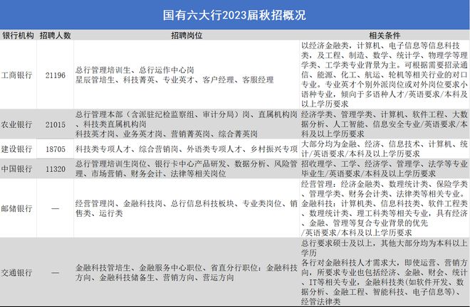 记者|曾仰琳 王景(实习) “银行变成大家高攀不起的行业了。”参加今年银行秋招的小婧感慨道。 小婧是来自北京外国语大学的会计硕士,她表示,今年的就业形势有些严峻,出于稳妥起见,她瞄准了各大银行的管理培训生岗位,正在积极备战秋招,已经投出了十几份简历。 人大经济类专业应届硕士毕业生小安也告诉界面新闻,最近刷了大量银行笔试和面试题,目前已完成7家银行笔试,获得5家银行面试邀约,完成2家银行第一轮面试。 2022年9月起,多家银行陆续公布2023年应届生招聘计划,银行秋招正式拉开帷幕。今年的银行秋招规模有何变化?哪些岗位是“香饽饽”?哪些专业更受银行青睐? 工行、建行等大行扩招,“金融科技岗”设专项招揽 据界面新闻记者统计,已公布招聘计划的国有六大行和股份制银行2023届校招规模整体与2022届持平,但其中有部分银行的招聘规模略有扩大。 以国有大行为例,工商银行总计招聘约2.1万名毕业生,较前一年增加2000余人;建设银行计划招聘约1.8万人,较上年增加1000余人;中国银行计划招聘约1.1万人,较上年略微增加100余人。 从招聘的岗位来看,金融科技人才仍是今年银行招聘的“香饽饽”。 从国有大行和股份制银行招聘信息可见,每家银行均设有“科技英才”相关岗位,包括软件产品研发、测试开发、数据分析等。该类岗位主要面向计算机、电子信息等信息科技类,适合工程、制造、数学、统计学、物理学等理学类、工学类专业背景的毕业生。 ![]() 图:国有六大行2023届秋招概况 (界面新闻记者据官网整理) 值得一提的是,不少银行将金融科技类人才招聘设为专项,并且计划招徕大量人才。 比如,工商银行总行直属的软件开发中心此次招聘金融科技人才达到900人;农业银行总行共招聘1100余人,科技类直属岗位就达836人。此次秋招中,部分银行会将金融科技岗的笔面试流程放在前面,这也反映出当前银行对金融科技岗位人才招聘的重视程度。 ![]() 图:12家股份制银行2023届秋招概况 (界面新闻记者据官网整理) 除了近几年热门的金融科技岗之外,银行秋招的岗位还包括管理培训生、业务管理岗位及客服经理等。由于今年银行秋招整体规模未有大的变化,金融科技类岗位需求增加,相应地,其他岗位招聘人数便有所减少,这些岗位主要面向经济金融类、外语类及其他大文科类专业毕业生。 从招聘公告来看,各大银行对管理培训生的岗位要求相对其他非技术岗更高,大部分银行要求应聘者需具有硕士学历,英语过四六级甚至需要达到某一分数,专业要求为经济金融、财务会计、法律、信息科技、数学等。而其他非技术岗大多未设过高门槛,学历要求均为本科以上,除诸如国际业务等特殊方向的岗位以外,专业方向上均未设限。 银行秋招“越来越卷”,部分岗位或名不副实 界面新闻记者了解到,银行秋招的基本流程分为“宣讲会—网申—笔试—面试(2—3轮)—体检—签约”,国有大行及股份制银行一般会和网申同步开启线下(线上)校园宣讲会。 目前,大部分银行已发布招募通知,正处于笔面试阶段,而国有六大行多处于投递筛选简历阶段。 据界面新闻了解,有一些国有行已在部分高校开启直通面试。小安在杭州的同学告诉她,十几天前已有银行到浙江大学组织线下招聘活动,她身边有的同学已经拿到了pass卡,只要再通过全国统一的笔试,就可以直接签约。而其他城市或因疫情和其他原因,暂未组织相关招聘活动。 多位受访者告诉界面新闻记者,相较于券商秋招所设的严苛条件和招聘人数,体量较大、对实习经历相对不是很看重的银行便成为不少经济类专业毕业生的选择。严峻的就业形势也让很多毕业生的选择趋于保守,纷纷着眼现实,寻求一份安全感。 在社交媒体上,不少参加银行秋招的毕业生纷纷感叹 ,“越来越卷了”、“被拒麻了”。有些毕业生投递的只是某银行的地方分行,但是同处于一个云端面试场的竞争者,依旧少不了来自国内一流高校甚至海外名校毕业生。 “投了20多家银行,除了拒信什么都没有,依旧还是零offer选手。“小婧告诉界面新闻记者,现在没有一个地方不卷,考公最卷,至于像互联网那些,一是今年招的本来就少,甚至于完全不招;二是就算招了你,可能也不敢去,因为怕失业,所以还是考银行。 “没信心”、“每个人都有那么点儿崩溃,但还是要有耐心,顺其自然。”多位参加银行秋招的毕业生表示,尽管银行公告中招聘条件看似未设太多限制,部分岗位未设专业限制,甚至部分银行总行招聘学历条件也仅为本科,但隐形的“第一学历歧视”或仍存在。海投之后要不拒信不断,要不没有回音,“双非”硕士被拒绝已是就业市场上的常态。 本科毕业于211院校的人大硕士小安坦言道,今年银行秋招中让她失望的一件事便是她的简历被一家地方银行卡掉。她曾在网上看到有评论称该银行或许是一家“学历行”,比较重视第一学历,恰巧她985本硕的同学大都已参加该行的面试。 界面新闻记者了解到,当前的就业形势使得银行招聘的部分岗位与实际从事工作会有些出入。 据多位受访者透露,大部分毕业生还是不愿意做柜员或是客户经理,这就导致“管理培训生”岗位投递人数很多。但银行实际能提供的真正的管培生名额有限,因此银行便会以“管理培训生”的名义进行招聘,但未来的实际工作可能就是在柜员、客服经理等岗位进行轮岗,有