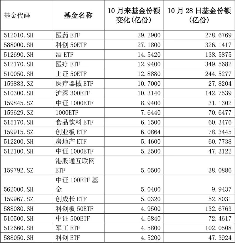 10月进入尾声,大量“聪明钱”在市场波动中,借道ETF逆势布局。Choice数据显示,截至10月28日,今年10月权益类ETF份额合计增长逾487亿份。其中,科创50ETF、上证50ETF等宽基ETF以及医药、酒、食品饮料、军工等行业类ETF资金净流入较多。 “聪明钱”借道ETF入市 Choice数据显示,截至10月28日,10月以来权益类ETF合计份额增长超487亿份,若剔除QDII基金,份额增长也超164亿份。 拉长时间看,今年9月以来,A股市场波动加大,但资金却在市场震荡中积极借道ETF入市。数据显示,9月以来,权益类ETF份额增长超过864亿份。 ![]() 上证指数近期走势图 业内人士认为,ETF作为市场上的投资风向标之一,历来为投资者所关注。由于ETF投资者相对更为成熟,往往会出现逆势买入的情况,这也被视作投资者对长期机会的看好。 从各大基金公司近期的观点来看,他们也普遍表示当前或适度乐观,可在波动中寻找合适的机会布局。 面对当前的A股市场,国联安基金认为,目前经济整体在缓慢修复,从盈利、无风险利率和风险溢价这三个主要因素来看,均对股市构成一定支撑。首先,经济修复对企业盈利构成支撑;其次,政策的适度宽松将促使无风险利率保持低位;最后,市场风险溢价已处于历史高位,目前的市场已隐含了较多的悲观预期。综合以上因素,一旦不确定性担忧有所缓解,市场或迎来趋势性上涨机会。 嘉实基金价值风格投资总监谭丽也认为,中国经济具有韧性,随着一些政策的出台,经济触底回升的可能性较大,这个时候可以适当乐观一些。就当前而言,能看到的市场机会正越来越多。 部分行业备受资金青睐 除了科创50ETF、上证50ETF等宽基ETF外,10月以来,医药、酒、食品饮料、军工等行业ETF也纷纷“吸金”。 ![]() 10月来份额增加较多的权益类ETF基金,不含QDII 值得注意的是,从去年年中至今经历了较长时间调整的医药板块,近期市场关注度提升,资金也借道行业ETF基金加速入场。 数据显示,易方达沪深300医药ETF10月以来份额增加逾29亿份、华宝中证医疗ETF和永赢中证全指医疗器械ETF也分别增加超12亿份、10亿份。按10月来的区间成交均价计算,这3只产品在此期间分别获得逾13亿元、6亿元、7亿元的资金净流入。 除了医药板块之外,资金也在波动中寻找其他机会。10月以来,鹏华中证酒ETF份额也增加14亿份有余;部分食品饮料ETF与房地产ETF的份额增加逾5亿份,此外军工ETF也增逾4亿份。 近1个月的机构调研情况与ETF资金动向也有所重合。Choice数据显示,医疗器械行业的机构访问量超过1573次,位居行业第一。具体来看,迈瑞医疗(322.510, -4.49, -1.37%)、开立医疗(55.730, -0.17, -0.30%)10月接受机构调研均超300次,另外,新雷能(50.700, 1.89, 3.87%)、兴森科技(11.660, -0.32, -2.67%)等近日也接受了上百次机构调研。 展望后市,兴业基金研究部权益研究总监邹慧看好四大领域机会。第一,结合当前宏观环境和上市公司业绩表现,他首先看好资源品领域的投资机会,包括原油和煤炭;第二,高景气成长方面,主要看好包括光伏、海上风电、国防军工和半导体设备等细分行业;第三,部分消费类及出行链公司,从供给端来看,诸如化妆品、快递等板块的竞争格局在逐渐优化;第四,医药板块方面,由于医疗设备更新贷款的催化,叠加部分设备集采力度好于预期的带动,估值在极低分位的医药值得关注。
