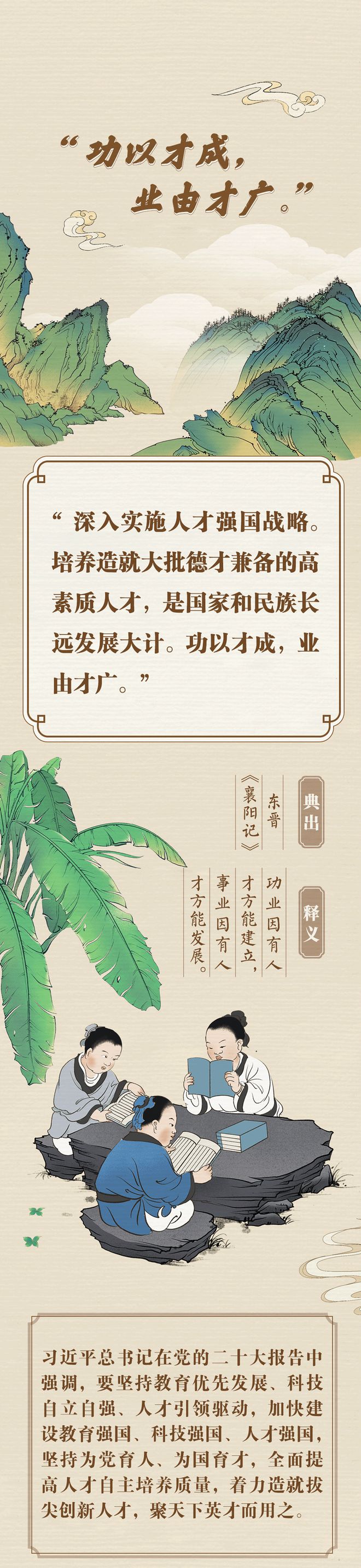 (原标题:“典”亮新征程丨功以才成,业由才广) 中华优秀传统文化源远流长、博大精深,是中华文明的智慧结晶。 习近平总书记在党的二十大报告中引用了很多中国古代经典名句,体现了中国人民的“宇宙观、天下观、社会观、道德观”,蕴含着丰富的治国理政思想智慧,彰显着历史自信、文化自信。 《“典”亮新征程》系列,与您一起学习这些古语,从中华优秀传统文化中汲取治国理政的智慧,将党的二十大精神转化为奋进新征程、建功新时代的强大力量。 ![]() ![]() 聚人才之力,筑复兴之基。 “实施科教兴国战略,强化现代化建设人才支撑”“深化人才发展体制机制改革”“全面提高人才自主培养质量,着力造就拔尖创新人才”...... 习近平总书记的重要论述,为新时代我国教育发展、科技进步、人才培养指明了前进方向,提供了根本遵循。 新征程上,在以习近平同志为核心的党中央坚强领导下,广大人才正以昂扬的姿态和卓有成效的业绩,奋力书写无愧于时代、无愧于人民的绚丽篇章。 |
