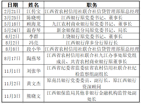 ![]() 江西金融系统近段时间反腐不断。 11月3日,据江西省纪委省监委网站消息,江西银保监局其他非银行金融机构监管处副处长熊晓文涉嫌严重违纪违法,经中央纪委国家监委驻中国银保监会纪检监察组与江西省监委批准,目前正接受中国银行保险监督管理委员会江西监管局纪委纪律审查和宜春市监委监察调查。 这已是11月以来第三名被查的江西金融系统人士,也是今年以来江西银保监局系统第二名被查的监管干部。11月1日,江西省纪委省监委驻省农村信用社联合社纪检监察组副组长刘张华被查。11月2日,原南昌银行党委委员、副行长黄文杰涉嫌严重违纪违法,主动投案,目前正接受江西省纪委省监委纪律审查和监察调查。 ![]() 江西金融系统人员被查名单,数据来源:江西省纪委省监委网站 就今年来看,江西省金融系统反腐动作频频,江西银保监局、江西省联社、江西银行、南昌银行等系统均有人员被查。其中,江西银行中高层“落马”不断,江西银保监局系统也有多人被查,且有监管干部已被开除党籍。 在熊晓文之前,今年5月,刚刚退休仅两个月的新余银保监分局原党委书记、局长温春琴被查。6月,去年11月被官宣调查的江西银保监局原二级巡视员章莳安,被开除党籍、取消退休待遇。 在江西银行方面,今年3月,江西银行原党委书记、董事长陈晓明被查。在官方宣布陈晓明被查前一个月,江西银行公告称,陈晓明因个人原因辞去江西银行一切职务。陈晓明“落马”两个月后,江西银行副行长、董秘徐继红被查。 此前,江西银行曾出现过解聘行长的情况,在业内较为罕见。2021年1月,江西银行公告称,时任行长罗焱的管理风格及理念与该银行之业务发展及实际需求不完全一致,决定解聘其行长职务。 目前,江西银行的董事长和行长均来自金融监管系统。今年1月,江西省地方金融监督管理局副局长骆小林任江西银行行长。几个月后,厦门银保监局局长曾晖出任江西银行党委书记、董事长。 江西银行系统内被查的还有主动投案的原南昌银行党委委员、副行长黄文杰。黄文杰于2015年12月进入江西银行,2018年2月任江西银行资深顾问,2022年2月退休。此外,今年8月,江西银行萍乡分行原行长冯亮涉嫌严重违纪违法被查。 除了江西银行,上饶银行原党委书记、董事长李群也在今年6月被查。9月,李群被开除党籍和公职。在任职上饶银行前,李群长期在江西金融监管系统任职,曾先后任职于中国人民银行鹰潭市分行、鹰潭银监分局、景德镇银监分局、上饶银监分局,曾担任景德镇银监分局党委书记、局长,上饶银监分局党委书记、局长等。 根据通报,经查,李群丧失理想信念,背离初心使命,对党不忠诚不老实,贯彻落实党中央关于防范化解金融风险决策部署不到位、搞变通,滥用贷款审批权造成金融风险,弃守管党治党政治责任,不愿监督、抵触监督,严重污染所在单位政治生态,与他人串供,对抗组织审查,信仰缺失,搞迷信活动;无视中央八项规定精神,奢靡腐化,大肆收受礼品礼金,频繁接受宴请和旅游安排,长期借用管理服务对象车辆,多次出入带有私人会所性质场所;组织观念淡漠,在组织函询时不如实说明问题,在干部选拔、职工录用等方面违规为他人谋取利益;价值观扭曲,既想当官又想发财,违规从事营利活动,大肆以瓷敛财,参与违规民间借贷,帮助他人承接采购业务并收受好处费,把贷款客户当成“提款机”,将应由本人支付费用由他人支付,沉迷享受贷款客户提供的“保姆式”“管家式”服务;不正确履行职责,违规干预插手工程项目承发包;目无法纪,以贷谋私,擅权妄为,大搞权钱交易,利用职务便利为他人在贷款审批、人事调整、工程承揽等方面谋利,并非法收受巨额财物。 农村金融机构是近些年金融风险领域的一大重灾区,江西省联社系统今年也有多人先后被查。仅省联社自身而言,江西省农村信用社联合社信贷管理部一个部门就出现了“前腐后继”的现象。今年2月,江西省联社信贷管理部原总经理江传宝被查;8月,江传宝的前任总经理段小华被查。 简历显示,2011年3月至2014年10月,段小华任江西省联社信贷管理部总经理。在他卸任后,江传宝接任这一职务。两年后,江传宝任江西省联社网络金融部调研员,段小华则先后担任金融创新部、安全保卫部调研员。2019年,江传宝辞职,段小华退休。 今年7月,江传宝被开除党籍。根据官方通报,江传宝丧失理想信念,背弃初心使命,毫无大局意识,贯彻党中央金融决策部署搞变通、打折扣,严重偏离农合金融机构职责定位,违规发放贷款;对党不忠诚、不老实,处心积虑对抗组织审查,安排多人为其代持巨额股金,费尽心机逃避组织调查,临近退休“逃逸式”离职;不信马列信鬼神,不信组织信“大师”;对中央八项规定精神置若罔闻,沉迷推杯换盏,与老板商人结成“吃喝圈”“玩乐圈”,长期接受影响公正执行公务的宴请和高档娱乐消费;违规收受影响公正执行公务的礼品礼金,长期借用贷款客户的豪华车辆;寡廉鲜耻,道德败坏,追求低级趣味,大搞钱色交易;在工作中不正确履行职责,并造成重大损失;私欲膨胀,把工作领域视为个人领地,把信贷资金当作利益筹码,以贷谋私,靠贷吃贷,大搞权钱交易,利用职务上的便利为他人在贷款办理、融资担保合作、工程承揽等方面谋取利益,大肆索要、非法收受巨额财物;违反国家规定发放贷款,造成巨额损失。 