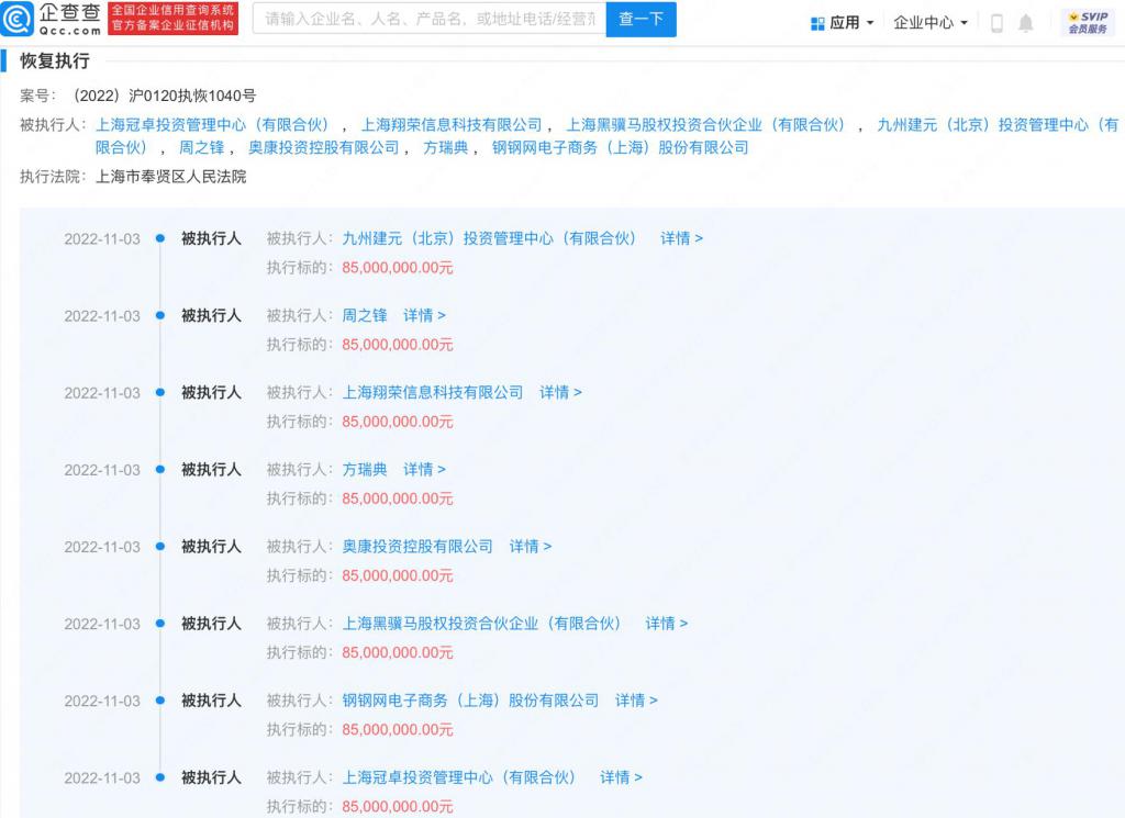 近日,九州建元(北京)投资管理中心(有限合伙)新增一则恢复执行信息,执行标的 8500 万,执行法院为上海市奉贤区人民法院。
