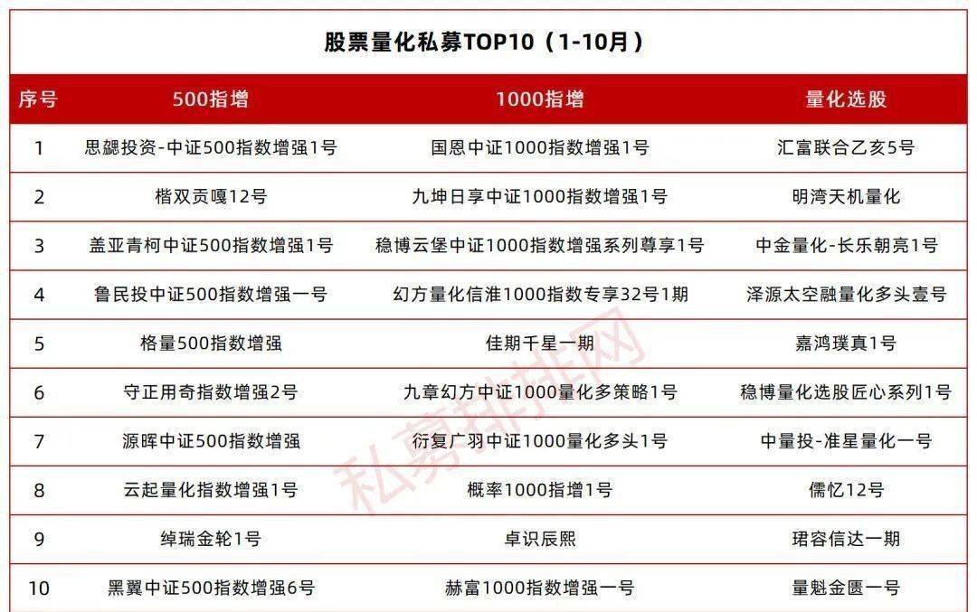 ![]() 量化多头策略是指通过数量化方法将主观的投资理念或投资思想转化成模型(通过计算机实现)的投资方式,该策略从个股选择、组合构建、交易等环节均以量化模型的结果为决策依据,杜绝主观情绪对投资决策的影响。与传统主观多头相比,量化多头策略程序化、持仓分散化等特征。 在国内市场中,目前较为常见的量化多头策略包括量化选股、指数增强等。量化选股是主观选股策略的“量化版”,一般收益来源于选股带来的α收益;而指数增强则收益来源包括对标指数的β收益、选股带来的α收益以及其他收益增强手段带来的收益(指数增强的投资目标在于跑赢对标指数)。 此外,指数增强根据选股范围的差异可分为沪深300指增、中证500指增、中证1000指增、其他指增。在A股市场来看,中小盘股更容易获得超额收益,因此以对标中证500指数的指数增强产品逐渐成为私募产品的主流。 基于私募指数增强产品的关注度与热度,综合存续基金数量,私募排排网特发布中证500指数增强、中证1000指数增强、量化选股1-10月、10月榜单。稳博投资、黑翼资产、佳期投资、源晖投资、概率投资、格量资产、赫富投资、九坤投资、九章资产等量化在多个维度均有上榜。 ![]() ![]() 【应合规要求,私募基金不能公开展示,文中涉及私募收益数据用***替代。】 量化多头私募基金TOP10榜单 500指增TOP10产品 截至10月底,纳入统计的净值1以上的中证500指数增强产品共有292只,年内平均收益-12.11%。同期,中证指数涨跌幅为-21.09%,280只产品年内获得正超额,占比为96%。 500指增1-10月榜单TOP10产品超额收益均超15%,登榜产品主要来自思勰投资、上海凯双私募基金、盖亚青柯私募基金、鲁民投基金等机构。 黑翼资产的“黑翼中证500指数增强6号”截至10月28日的年内超额收益为***%。 黑翼资产表示,从中长期来看,中国经济持续向好趋势不变,A股的机会仍将大于风险。当前,沪深300指数、中证500指数、中证1000指数的估值都相对处于低位,正是配置指数增强产品的好时机。从A股市场长期的贝塔和阿尔法收益来看,投资者可以长期持有量化指数增强类产品。 另从10月维度来看,中证500指数涨幅为1.63%,来自玄同投资的“玄同量化500增强”以***%的收益夺冠,信弘天禾的“信弘中证500指数增强1号”屈居第二。佳期投资、云起量化、源晖投资、黑翼资产旗下亦有500指增产品入围。 1000指增TOP10产品 在2022年6月22日,中国金融期货交易所就中证1000股指期货和股指期权相关规则向社会公开征求意见。7月22日,首批中证1000股指期货、股指期权产品正式上市,这也让中证1000指增产品热度掀起小高潮,百亿私募更是率先布局。 1000指增超额收益明显,私募排排网数据显示,符合文中统计规则的1000指增样本数量仅47只,年内平均收益-7.59%,同期指数跌幅为-21.44%,纳入统计的47只基金全部取得正超额。 九坤投资姚齐聪管理的“九坤日享中证1000指数增强1号”截至10月31日的收益为***%,超额收益***%,是榜单的第二名。 据悉,九坤投资秉承长期投资理念,认为长期阿尔法能力是评价量化私募更为合理的指标,仅就时点而言,公司不建议对短期的波动去做主观评判。九坤投资近期重新放开1000指增产品的额度,也沿用了九坤产品一贯的三年期锁定设置。自今年3月开始,基于对市场长期的信心,九坤投资自有资金制定了3年期3.6亿每月定投1000万的计划,与投资人并肩前行,风险共担。 百亿私募是1000指增的“主力”,另有宁波幻方量化、佳期投资、九章资产、衍复投资、卓识投资等百亿量化私募旗下也有产品进入榜单前十。 中小私募也突围,在10-20亿规模的私募管理人中,仅有概率投资的“概率1000指增1号”上榜,截至10月28日,年内取得***%正超额。 概率投资认为,目前各大指数仍然在历史低位水平,权益市场大幅回调之后,投资者悲观情绪依然浓厚,但权益资产的配置性价比相较去年有了显著提升。权益市场在波动中向前,市场调整是风险也是机遇。市场的反弹或反转往往集中在少数交易日中,非理性的空仓、减仓很有可能错失这些关键的交易日期。在市场低位时保持投资非常重要,所以目前是配置指数增强的好时机。 中证1000指数10月涨幅为2.74%,稳博投资的“稳博安心中证1000指数增强系列6号”以***%的收益夺冠。不仅如此,“稳博云堡中证1000指数增强系列尊享1号”年内超额***%,还是1-10月榜单的第三名。 对于当下是否为配置指数增强产品的好时机,稳博投资介绍,在投资过程中,市场是具有反升性的,也是有一定规律的,如果涨了太多,则会有下跌的可能,反之亦然,市场上没有投资标的是可以保证永远往上走的。在配置上,300、500、1000或者全市场选股都是很好的配置方向,但是对于自身而言,当下市场环境, 1000指增和量化选股是比较可能做出超额的赛道。 鸣石私募基金的“鸣石宽墨七号”在10月份也是成功登榜1000指增榜单。 鸣石私募基金指出,股市的逐步企稳反弹,市场风险在一定程度上得到了大幅释放,宽基指数估值也回落至底部区域,具备较高的配置性价比指数增强策略一方面受益于其挂钩的宽基指数上涨,另一方面受益于量化选股上的超额收益,在市场震荡上行期,产品收益叠加行业Beta和超额Alpha,优势十分明显。 具体到投资标的,鸣石私募基金认为,沪深300指数增强、中证500指数增强和中证1000指数增强等产品,业绩弹性由低到高,目前