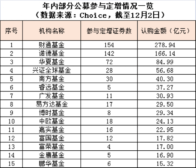 中国基金报记者 张玲 今年以来,市场震荡加剧,A股再融资市场也受到一定程度的影响。不过进入下半年后,定增市场持续回暖,多家公募也积极抢筹,且不乏知名基金经理身影。数据显示,截至12月2日,年内公募认购定增总额已破千亿元,其中近七成为下半年以来认购。 多位业内人士表示,下半年以来A股市场逐步见底企稳,并迎来较好的投资布局窗口期,定增项目的投资胜率较大,因此公募等机构参与定增的积极性大大提高。由于当前折价率仍处于历史较高水平,预计定增市场的回暖迹象有望持续,可关注高景气度和高成长板块等定增项目的投资机会。 ![]() 定增市场持续回暖 年内公募斥资千亿参与定增 12月以来,华夏基金、鹏华基金、财通基金、信达澳亚基金等多家公募相继发布参与定增公告。其中,信达澳亚基金冯明远管理的8只产品参与了中伟股份定增,合计认购数量超169.85万股,总成本合计1.20亿元。 ![]() 事实上,进入下半年以来,定增市场持续回暖,公募参与定增次数也明显增多。Choice数据显示,以增发公告日为准,截至12月2日,年内已有56家公募参与上市公司定增,合计认购总额达1003.54亿元,其中下半年以来参与定增金额达686.58亿元,占比近七成。 从定增金额排名靠前的公募年内认购情况来看,财通基金、诺德基金、华夏基金年内认购总额分别为278.94亿元、166.14亿元、84.99亿元,其中下半年以来的认购总额分别为190.41亿元、110.28亿元、55.38亿元,占年内比重均超六成。 上市公司实施定增方面,Wind数据显示,以定增股份上市日为准,截至12月2日,年内已有310家上市公司实施定向增发,实际募资总额达6104.82亿元,其中下半年以来募资总额达4175.53亿元,占比超六成。此外,以12月2日收盘价计算,67%的上市公司定增项目能够取得浮盈,平均折价率16.43%。 对于下半年以来定增市场持续回暖,汇成基金研究中心表示,通常定增发行人会选择市场行情平稳、有利于顺利完成融资流程的环境发行。今年上半年,受美联储加息、俄乌冲突、国内疫情等因素影响,A股市场波动较大、下跌明显,因此部分发行人在该时期选择观望等待,而投资者也在熊市参与定增项目的态度更为谨慎。 “随着下半年俄乌冲突进展到后期,美联储加息预期在经济衰退预期增强的背景下开始放缓,国内出台多项经济刺激政策,A股市场逐步见底企稳,优质上市公司估值已经跌至性价比较高区间,市场迎来较好的投资布局窗口期,此时定增项目的投资胜率较大,因此见到下半年以来定增融资规模明显上涨。”汇成基金表示,公募基金一直是定增市场的重要投资者,公募基金对优质公司标的覆盖更为密切、认知更为深刻,在看好的前提下,参与一级市场定增比二级市场个股投资可获得更大的折价、更大规模的股权,因此公募下半年频频参与定增。 上海证券基金评价研究中心高级基金分析师、博士孙桂平表示,首先,下半年定增折扣率相比上半年有所增加,折价安全垫效应增强导致参与机构热情较高;其次,权益市场经过上半年调整后,呈现企稳迹象,长期投资价值显现,使得定增市场的整体风险有所缓解;最后,公募基金作为长期投资、价值投资的践行者,有一定折扣空间的具有长期配置价值的定增项目为公募基金提供了较好的建仓机会。 “根据choice 数据显示,实际上在2021年,公募基金参与定增项目的规模或已创历史之最,规模、累计参与项目数相较2020年增长超过30%。”财通基金表示,这印证他们在去年报告中做出的判断,即定增投资的二级属性正在强化,成为主流机构投资者参与权益市场性价比较高的一种方式。 财通基金认为,从逻辑上看,锁定期变短,使公募基金对定增标的持有时间与预期更加匹配;同时,市场供给更多,公募基金可以用折扣参与本身心仪的标的。二者都使公募参与定增的积极性越来越高,“此外,定增折价好比市场的一次回调,大量的市场数据显示,定增投资已成为公募基金换仓的重要工具之一。” 定增市场长期发展空间仍存 建议关注高景气度、高成长板块等 另一方面,尽管下半年以来定增市场持续回暖,但整体来看年内表现未及去年同期。对此上海证券基金评价研究中心孙桂平表示,受资本市场持续动荡、折价率缩小、定增项目供应减少等众多因素影响,今年定增市场表现不及去年同期,但对比最近十年的定增情况来看,今年折价率仍处于历史上较高水平,预计定增市场的回暖迹象有望持续。具体来看,可适当关注高景气度和高成长板块,以及当前受疫情影响较大的板块等定增项目的投资机会。 作为定增市场最大的市场参与者之一和定增投资策略最全的机构投资者之一,财通基金表示,定增市场的参与逻辑和配置价值长期存在,平稳向上的A股市场更利于定增市场投资者。定增投资者应合理看待定增市场,通过分散投资降低风险并降低短期收益预期,以维持良好的投资心态。“定增市场很多优秀的投资者以长期参与、长期配置的心态,通过合理的投资节奏利用时间平滑价格波动,力争持续捕捉市场贝塔收益及定增折扣收益。” 汇成基金表示,证监会于2020年2月发布的一系列再融资新规,无论对投资端还是融资端,都是历史上最佳的定增政策。在此背景下,我国定增市场再度回暖,定增融资规模明显回升。而2022年以来,新政带来的上市公司融资需求集中释放期结束,叠加A股市场波动剧烈,定增高峰已过,项目供给回