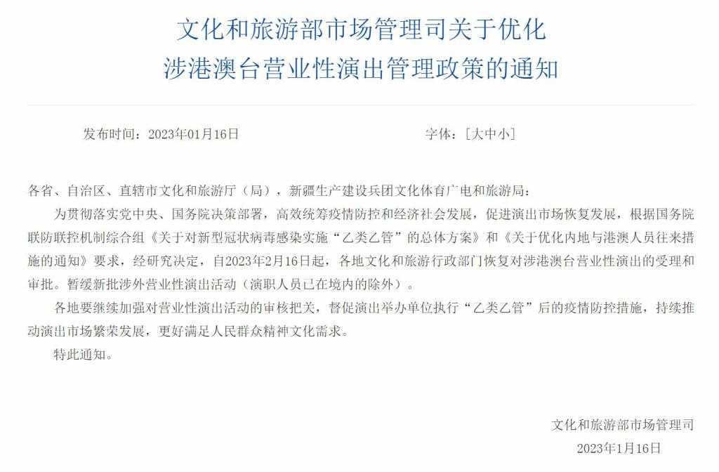 16 日,文旅部市场管理司发布关于优化涉港澳台营业性演出管理政策的通知。通知称,为贯彻落实党中央、国务院决策部署,高效统筹疫情防控和经济社会发展,促进演出市场恢复发展,根据国务院联防联控机制综合组《关于对新型冠状病毒感染实施 " 乙类乙管 " 的总体方案》和《关于优化内地与港澳人员往来措施的通知》要求,经研究决定,自 2023 年 2 月 16 日起,各地文化和旅游行政部门恢复对涉港澳台营业性演出的受理和审批。暂缓新批涉外营业性演出活动 ( 演职人员已在境内的除外 ) 。