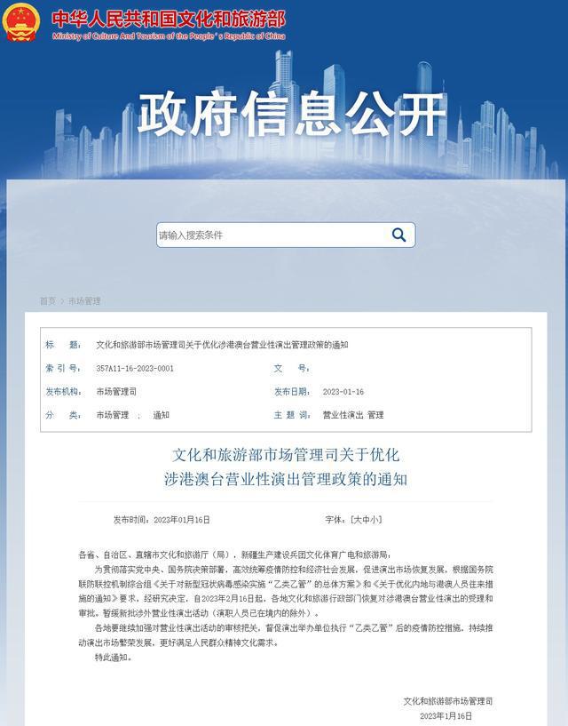 1 月 16 日,文旅部官网发布 " 文化和旅游部市场管理司关于优化涉港澳台营业性演出管理政策的通知 "。