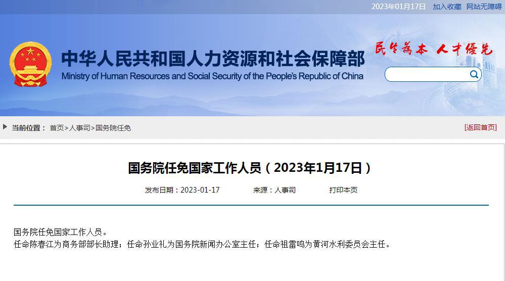 中新网 1 月 17 日电 据人社部网站 17 日消息,国务院任免国家工作人员。任命陈春江为商务部部长助理;任命孙业礼为国务院新闻办公室主任;任命祖雷鸣为黄河水利委员会主任。