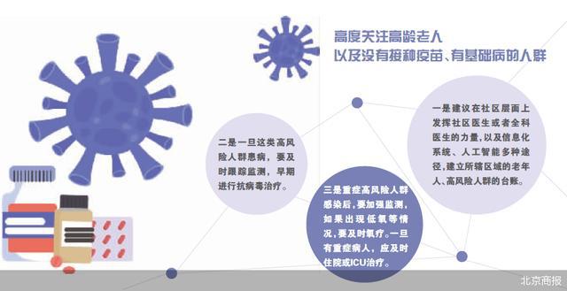 要高度关注高龄老人以及没有接种疫苗、有基础病的人群。王贵强说,对老年人、有基础病的人群,要关口前移、早期干预。一是建议在社区层面上发挥社区医生或者全科医生的力量,以及信息化系统、人工智能多种途径,建立所辖区域的老年人、高风险人群的台账。二是一旦这类高风险人群患病,要及时跟踪监测,早期进行抗病毒治疗。三是重症高风险人群感染后,要加强监测,如果出现低氧等情况,要及时氧疗。一旦有重症病人,应及时住院或 ICU 治疗。