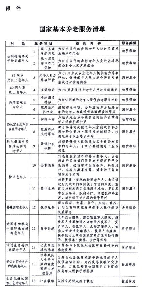 新华社北京5月21日电 中共中央办公厅、国务院办公厅印发了《关于推进基本养老服务体系建设的意见》,并发出通知,要求各地区各部门结合实际认真贯彻落实。 《关于推进基本养老服务体系建设的意见》主要内容如下。 基本养老服务在实现老有所养中发挥重要基础性作用,推进基本养老服务体系建设是实施积极应对人口老龄化国家战略,实现基本公共服务均等化的重要任务。党的十八大以来,在党中央坚强领导下,基本养老服务加快发展,内容逐步拓展,公平性、可及性持续增强。为贯彻落实党中央、国务院有关决策部署,健全基本养老服务体系,更好保障老年人生活,现提出如下意见。 一、总体要求 (一)指导思想。以习近平新时代中国特色社会主义思想为指导,立足新发展阶段,完整、准确、全面贯彻新发展理念,构建新发展格局,坚持党对基本养老服务体系建设的全面领导,坚持以人民为中心,坚持以改革创新为根本动力,加快建成覆盖全体老年人、权责清晰、保障适度、可持续的基本养老服务体系,不断增强老年人的获得感、幸福感、安全感。 (二)主要任务。基本养老服务是指由国家直接提供或者通过一定方式支持相关主体向老年人提供的,旨在实现老有所养、老有所依必需的基础性、普惠性、兜底性服务,包括物质帮助、照护服务、关爱服务等内容。基本养老服务的对象、内容、标准等根据经济社会发展动态调整,“十四五”时期重点聚焦老年人面临家庭和个人难以应对的失能、残疾、无人照顾等困难时的基本养老服务需求。 (三)工作原则 ——基础性原则。立足我国基本国情,统筹考虑必要性和可能性,着眼保基本、广覆盖、可持续,尽力而为、量力而行,保障老年人的基本生活和照料需要。 ——普惠性原则。在提高基本公共服务均等化水平的过程中,逐步拓展基本养老服务的对象和内容,使所有符合条件的老年人能够方便可及、大致均等地获得基本养老服务。 ——共担性原则。在赡养人、扶养人切实履行赡养、扶养义务基础上,通过提供基本养老服务、发挥市场作用、引导社会互助共济等方式,帮助困难家庭分担供养、照料方面的负担。 ——系统性原则。推动社会保险、社会救助、社会福利、慈善事业、老年优待等制度资源优化整合,强化各相关领域体制改革配套衔接,支持基本养老服务体系发展。 二、重点工作 (一)制定落实基本养老服务清单。各地区各有关部门要严格落实《国家基本养老服务清单》(见附件)。《国家基本养老服务清单》明确的对象、项目、内容等,根据经济社会发展水平、财力状况等因素动态调整,由民政部会同相关部门适时提出修订意见,按程序报批后以部门名义印发实施。省级政府应当对照《国家基本养老服务清单》制定并发布本地区基本养老服务具体实施方案及清单,明确具体服务对象、内容、标准等,其清单应当包含《国家基本养老服务清单》中的服务项目,且覆盖范围和实现程度不得低于《国家基本养老服务清单》要求。到2025年,基本养老服务制度体系基本健全,基本养老服务清单不断完善,服务对象、服务内容、服务标准等清晰明确,服务供给、服务保障、服务监管等机制不断健全,基本养老服务体系覆盖全体老年人。 (二)建立精准服务主动响应机制。建立老年人状况统计调查和发布制度,开展老年人能力综合评估,制定完善全国统一的评估标准,推动评估结果全国范围互认、各部门按需使用。依托全国一体化政务服务平台,推进跨部门数据共享,建立困难老年人精准识别和动态管理机制,细化与常住人口、服务半径挂钩的制度安排,逐步实现从“人找服务”到“服务找人”。推动在残疾老年人身份识别、待遇享受、服务递送、无障碍环境建设等方面实现资源整合,加强残疾老年人养老服务保障。面向独居、空巢、留守、失能、重残、计划生育特殊家庭等老年人提供探访关爱服务。支持基层老年协会、志愿服务组织等参与探访关爱服务。依托基层管理服务平台,提供养老服务政策咨询、信息查询、业务办理等便民养老服务。 (三)完善基本养老服务保障机制。推动建立相关保险、福利、救助相衔接的长期照护保障制度。合理确定经济困难失能老年人护理补贴覆盖范围和补贴标准。地方各级政府应当建立基本养老服务经费保障机制,中央财政统筹现有资金渠道给予支持。落实发展养老服务优惠扶持政策,鼓励社会力量参与提供基本养老服务,支持物业服务企业因地制宜提供居家社区养老服务。将政府购买服务与直接提供服务相结合,优先保障经济困难的失能、高龄、无人照顾等老年人的服务需求。具备条件的地方优化养老服务机构床位建设补助、运营补助等政策,支持养老服务机构提供基本养老服务。鼓励和引导企业、社会组织、个人等社会力量依法通过捐赠、设立慈善基金、志愿服务等方式,为基本养老服务提供支持和帮助。开展基本养老服务统计监测工作,建立基本养老服务项目统计调查制度。 (四)提高基本养老服务供给能力。设区的市级以上地方政府应当将养老服务设施(含光荣院)建设纳入相关规划,结合当地经济社会发展水平、老年人口状况和发展趋势、环境条件等因素,分级编制推动养老服务设施发展的整体方案,合理确定设施种类、数量、规模以及布局,形成结构科学、功能完备、