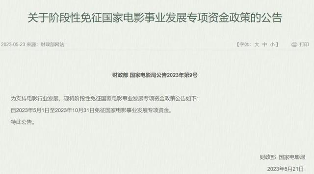 中新网 5 月 23 日电 据国家电影局网站 23 日消息,财政部、国家电影局日前发布关于阶段性免征国家电影事业发展专项资金政策的公告。公告称,为支持电影行业发展,自 2023 年 5 月 1 日至 2023 年 10 月 31 日免征国家电影事业发展专项资金。 ( 中新财经 )